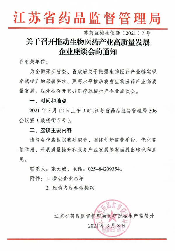 3月12日上午,科進(jìn)公司領(lǐng)導(dǎo)應(yīng)邀參加江蘇省藥品監(jiān)督管理局組織的“推動(dòng)生物醫(yī)藥產(chǎn)業(yè)高質(zhì)量發(fā)展企業(yè)座談會(huì)”。參加會(huì)議的有江蘇魚躍、南微醫(yī)學(xué)、諾唯贊等十家省內(nèi)知名企業(yè)。江蘇省藥監(jiān)局陳和平副局長(zhǎng),醫(yī)療器械生產(chǎn)監(jiān)管處和稽查處的有關(guān)同志參加,監(jiān)管處張興華處長(zhǎng)主持。